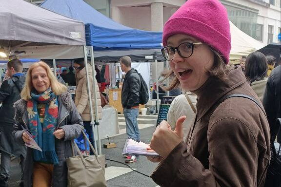 Aujourd’hui, nous étions au marché des Quatre-Moulins pour imaginer l’avenir et notre ville commune avec les habitantes et les habitants. Nous n’avons pas pensé à prendre de photographies de notre action d’aujourd’hui ; voici donc une autre photo, prise lors d’un précédent marché.